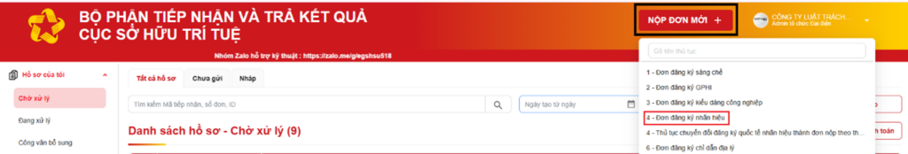 Sau khi đăng nhập thành công, ấn chọn “Nộp đơn mới” và chọn mục số 4 – Đơn đăng ký nhãn hiệu.