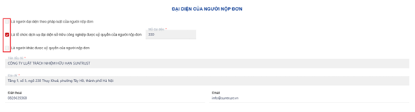 Trong các trường hợp Chủ đơn đăng ký nhãn hiệu không tự mình đăng ký mà nhờ người khác nộp thay hoặc nộp thông qua tổ chức đại diện, thì tại mục “Đại diện của người nộp đơn” phải tích chọn mục tương ứng.