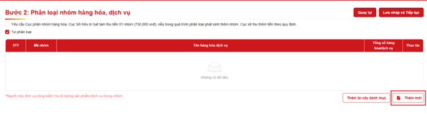 Trong trường hợp tự phân loại, cá nhân/tổ chức sẽ chọn thêm sản phẩm/dịch vụ từ cây danh mục có sẵn hoặc chọn thêm mới để tải lên danh mục sản phẩm/ dịch vụ mà mình đã chuẩn bị.