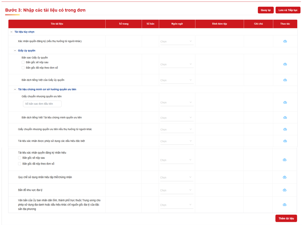 Sau khi điền đầy đủ các thông tin theo yêu cầu ở bước nêu trên, cá nhân/ tổ chức nộp đơn tải lên các tài liệu kèm theo đơn (nếu có). Sau đó ấn lưu và tiếp tục.